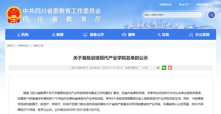 根據《四川省教育廳關于開展首批現代產業學院申報與建設工作的通知》要求,經省內各高校申報、專家綜合評議和廳長辦公會審議等相關程序,擬推薦15所普通本科高校的17個項目作為首批省級現代產業學院項目,其中2個項目經前期推薦已進入國家級現代產業學院項目立項;同時,10所高職學校依托教育廳、經信廳、財政廳、科技廳四部門聯合組織評選的首批10個省級產教融合示范項目建設的產業學院,擬直接納入認定范圍。公示期為2022年1月21日至1月27日。