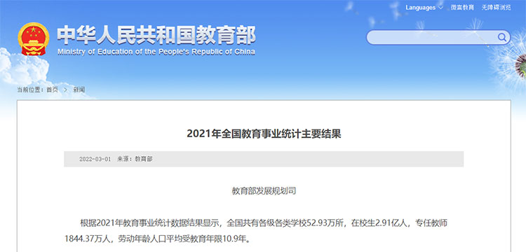 2021年,全國共有高等學校3012所,其中,普通本科學校1238所;本科層次職業學校32所;高職(專科)學校1486所;成人高等學校256所。各種形式的高等教育在學總規模4430萬人,高等教育毛入學率57.8%。
