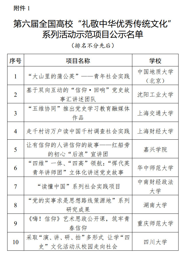 近日,教育部思想政治工作司公示了第六屆全國高校“禮敬中華優秀傳統文化”系列活動遴選結果。
