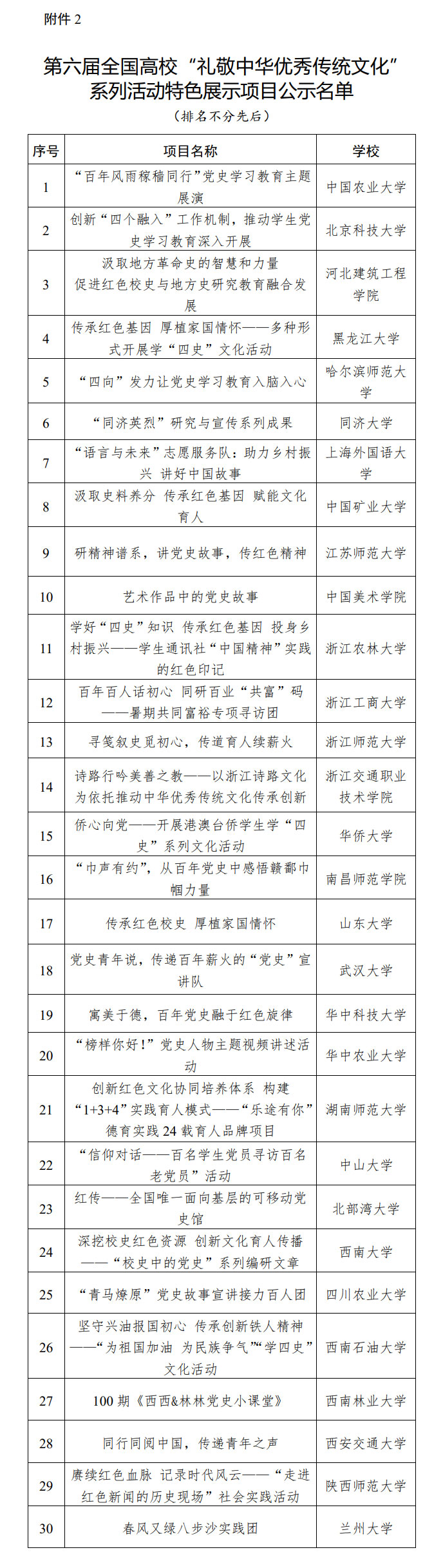 根據《教育部辦公廳關于開展第六屆全國高校“禮敬中華優秀傳統文化”系列活動的通知》(教思政廳函〔2021〕5號)要求,經高校自主申報、專家審核推薦等環節,產生示范項目10項、特色展示項目30項。公示期為2022年9月26日至10月2日。
