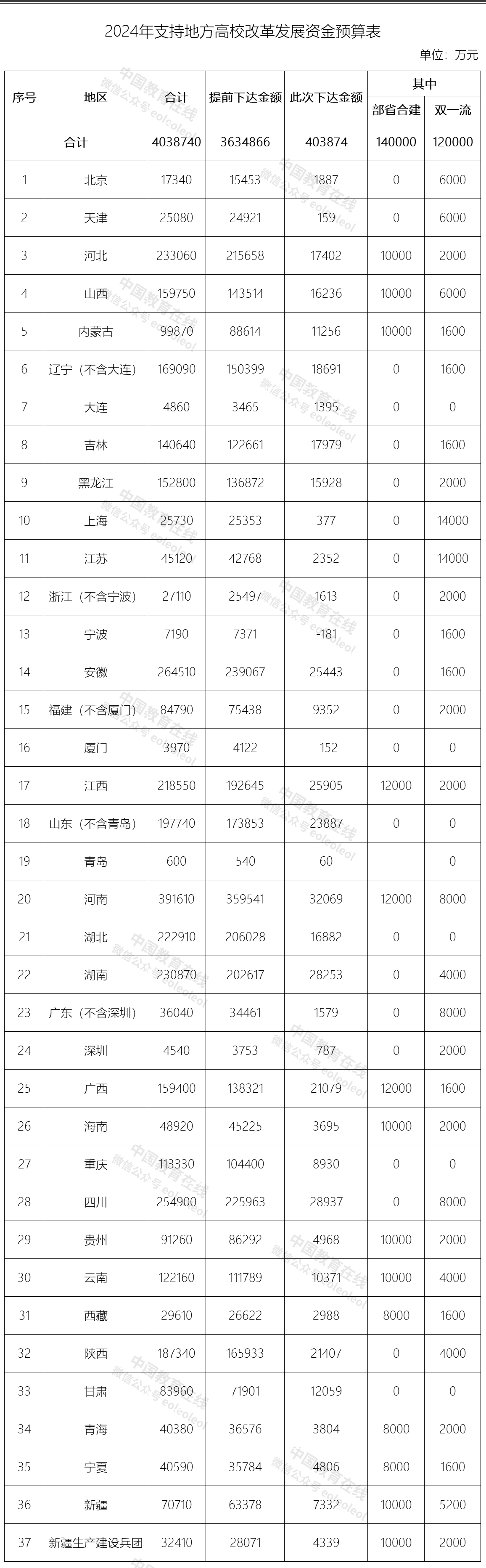 2024年支持地方高校改革發展資金預算表如下: