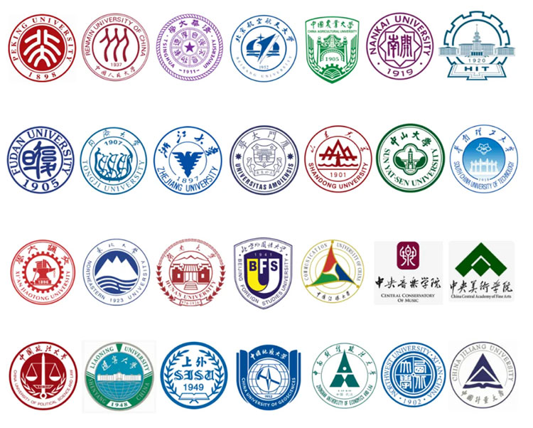 北京大學、中國人民大學、清華大學、北京航空航天大學、中國農業大學、南開大學、哈爾濱工業大學、復旦大學、同濟大學、浙江大學、廈門大學、山東大學、中山大學、華南理工大學、西安交通大學、東北大學、湖南大學、北京外國語大學、中國傳媒大學、中央音樂學院、中央美術學院、中國政法大學、遼寧大學、上海外國語大學、中國地質大學(北京)、中南財經政法大學、西北大學、中國計量大學