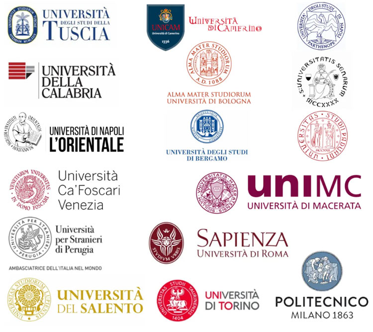 巴里LUM大學、巴里理工大學、貝加莫大學、博洛尼亞大學、都靈大學、都靈理工大學、卡拉布里亞大學、卡梅里諾大學、羅馬Link校園大學、羅馬國際研究大學、羅馬第一大學、馬切拉塔大學、米蘭理工大學、那不勒斯東方大學、那不勒斯費德里科二世大學、那不勒斯“帕特諾普”大學、佩魯賈外國人大學、帕多瓦大學、薩倫托大學、圖西亞大學、威尼斯大學、錫耶納大學