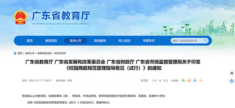 近日,廣東省教育廳等四部門發布《校園商超規范管理指導意見(試行)》。明確提出,中小學、幼兒園一般不得在校內設置校園商超,已經設置的,要逐步退出。寄宿制中小學可根據學校實際需求,征求家委會和學生代表意見后,經學校領導班子、校代會或教代會等方式集體討論后決定。