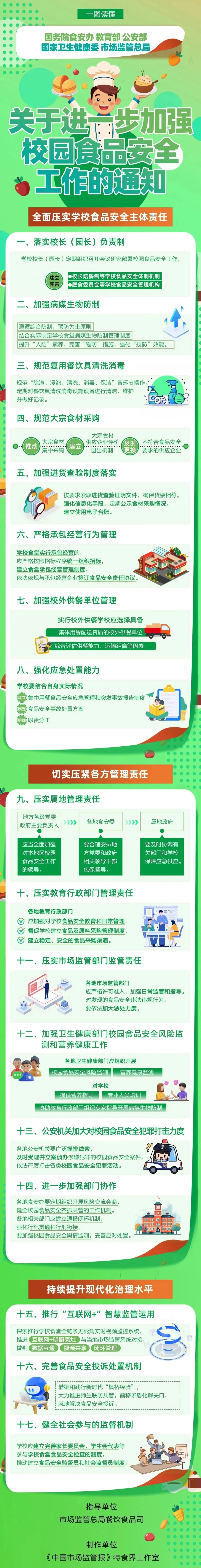 近日,國務院食安辦聯合教育部、公安部、國家衛生健康委、市場監管總局印發《關于進一步加強校園食品安全工作的通知》(以下簡稱《通知》),聚焦校園食品安全主體責任、管理責任和現代化治理水平,部署各地進一步健全校園食品安全全鏈條防控風險的制度機制,強化校園食品安全保障。