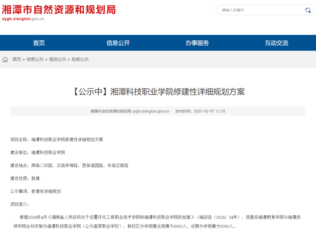 2月7日,湘潭市自然資源和規劃局公示湘潭科技職業學院修建性詳細規劃方案。根據2024年4月《湖南省人民政府關于設置懷化工商職業技術學院和湘潭科技職業學院的批復》,同意將湘潭教育學院與湘潭技師學院合并改制為湘潭科技職業學院(公辦高等職業學校),新校區辦學規模總規模為8000人,近期辦學規模為5000人。