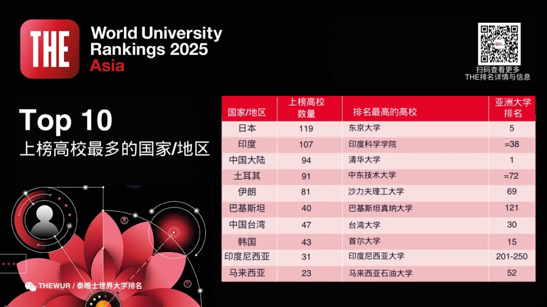 日本是上榜院校最多的國家/地區,共有119所高校上榜。其次是印度(107所)和中國大陸(94所)。烏茲別克斯坦、巴林、蒙古和敘利亞是今年新上榜的國家/地區。