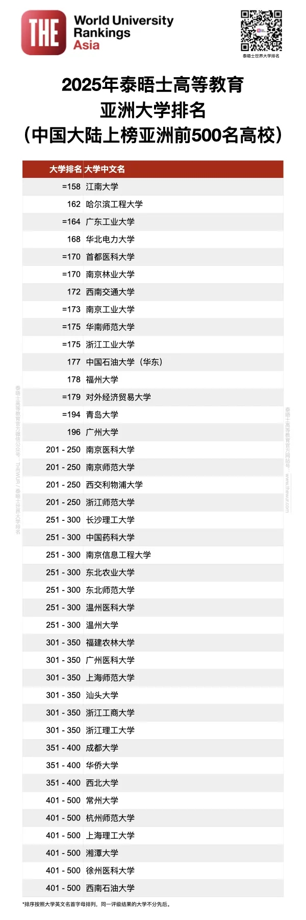 中國大陸共有94所高校上榜,是上榜高校數量排在第三國家/地區,僅次于日本(119所)和印度(107所)。中國大陸有25所高校創下了史上最佳表現,28所高校的排名較去年有所提升。