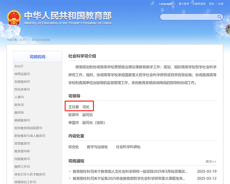 日前,教育部官網顯示,王日春出任教育部社會科學司司長,原社科司司長徐青森現任教育部黨組成員、副部長。
