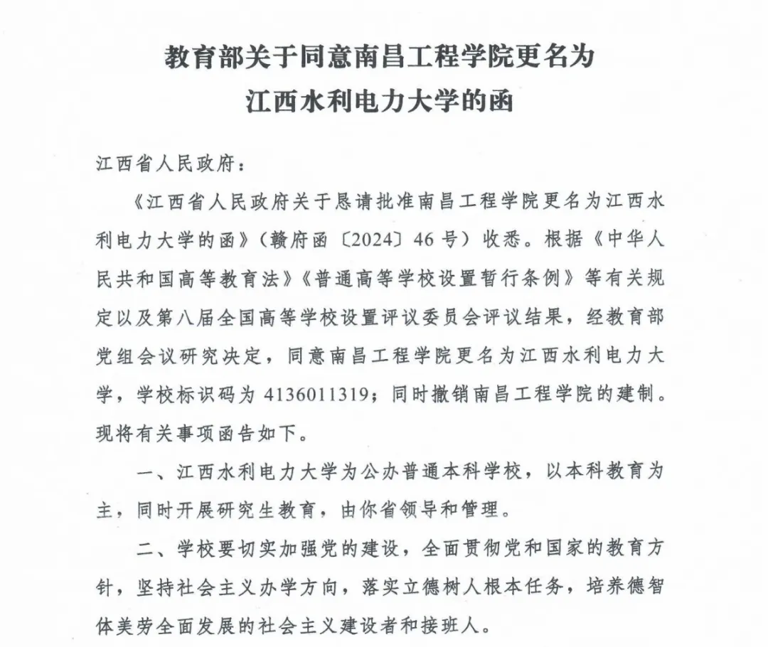 近日,教育部向江西省人民政府發送《教育部關于同意南昌工程學院更名為江西水利電力大學的函》,經教育部黨組會議研究決定,同意南昌工程學院更名為江西水利電力大學。