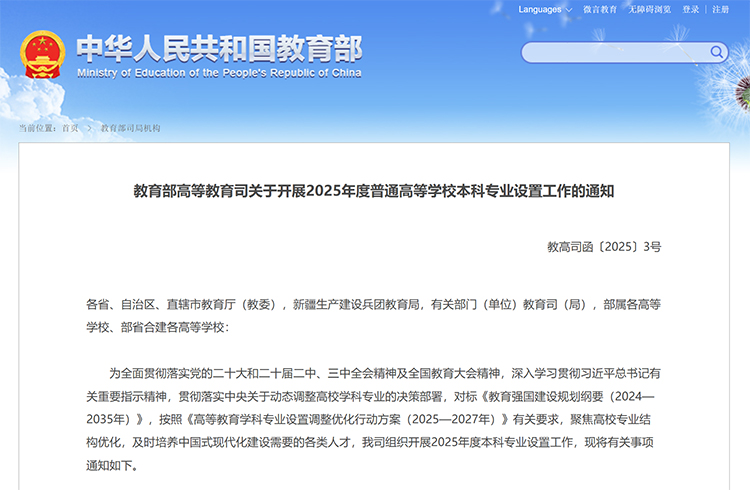 教育部高等教育司關于開展2025年度普通高等學校本科專業設置工作的通知