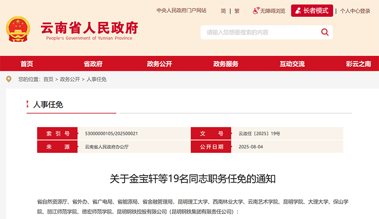 近日,云南省人民政府發布《關于金寶軒等19名同志職務任免的通知》,其中涉及昆明理工大學、西南林業大學、云南藝術學院、昆明學院、大理大學、保山學院、麗江師范學院、德宏師范學院等多所高校。