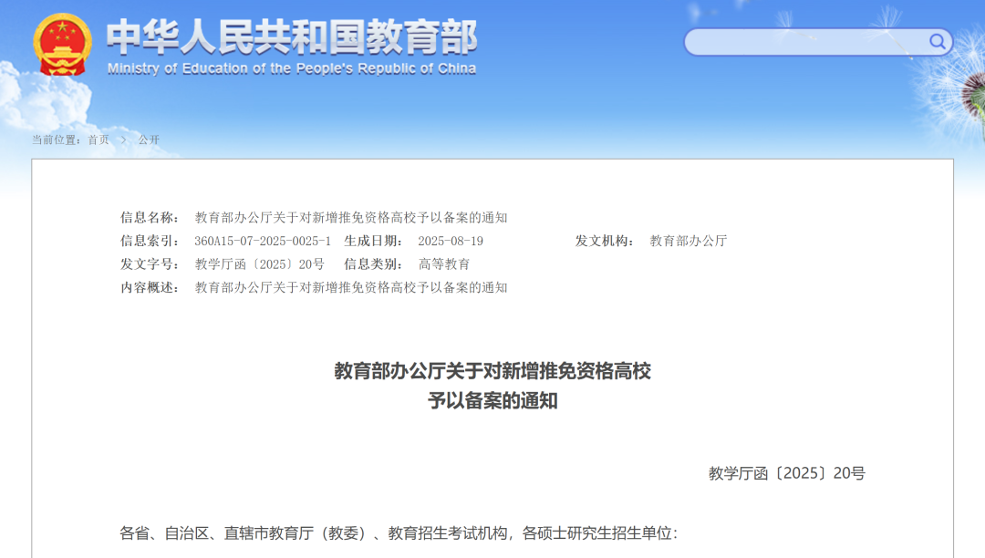 9月12日,教育部辦公廳發布《關于對新增推免資格高校予以備案的通知》。