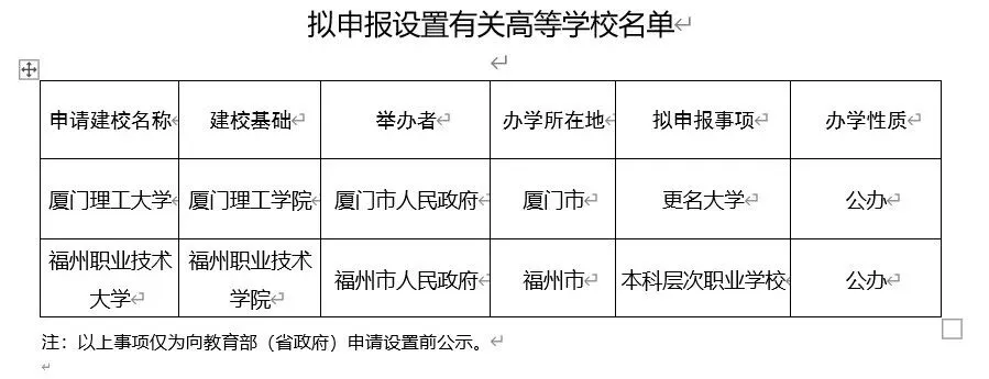 10月15日,福建省教育廳發布《關于擬申報高校設置事項的公示》,擬向教育部(省政府)申報廈門理工學院更名為廈門理工大學、在福州職業技術學院的基礎上建立福州職業技術大學。