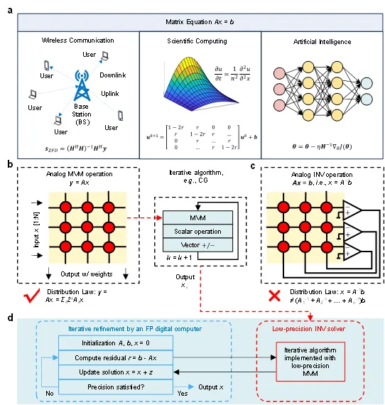 論文通訊作者孫仲表示,模擬計算是早期計算機的核心技術,通過物理定律直接運算,具有高并行、低延時、低功耗的先天優勢。然而,由于傳統模擬計算精度低、難擴展,逐漸被高精度、可編程的數字計算取代,成為存于教科書中的“老舊技術”。“如何讓模擬計算兼具高精度與可擴展性,從而在現代計算任務中發揮其先天優勢,一直是困擾全球科學界的‘世紀難題’。數字計算雖精度高,但計算速度慢,同時存在馮·諾依曼架構的‘內存墻’問題,已成為人工智能、科學計算和6G通信發展的瓶頸。”
