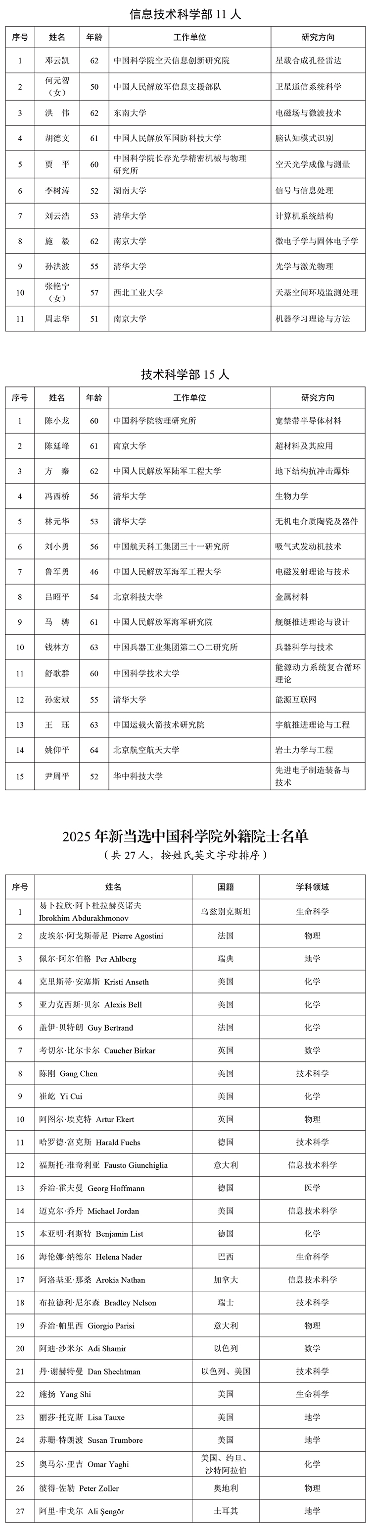 中國科學院、中國工程院11月21日公布2025年院士增選結果,分別選舉產生中國科學院院士73人,中國工程院院士71人。