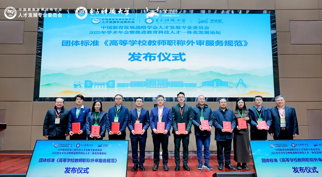 2025年11月22日,中國教育發展戰略學會人才發展專業委員會2025年學術年會暨推進教育科技人才一體化發展論壇在電子科技大學成功舉辦。論壇期間舉行了《高等學校教師職稱外審服務規范》(T/CSEDS 0006—2025)團體標準(以下簡稱“《規范》”)發布儀式。中國教育發展戰略學會常務副會長兼人才發展專委會理事長李志民、人才發展專委會學術委員會主任、國務院參事石勇共同為參編單位頒發證書。該標準于2025年11月20日起正式實施,旨在通過標準化手段,破解高校教師職稱外審工作中的痛點與難點,為構建科學、公正、規范的人才評價體系提供重要支撐。