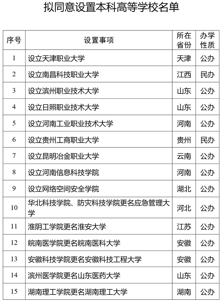 1月4日,教育部發布《關于擬同意設置本科高等學校的公示》。根據《中華人民共和國高等教育法》《普通高等學校設置暫行條例》《普通本科學校設置暫行規定》《本科層次職業學校設置標準(試行)》等有關規定,經教育部黨組會議審議,擬同意設置天津職業大學等15所學校,現予公示。