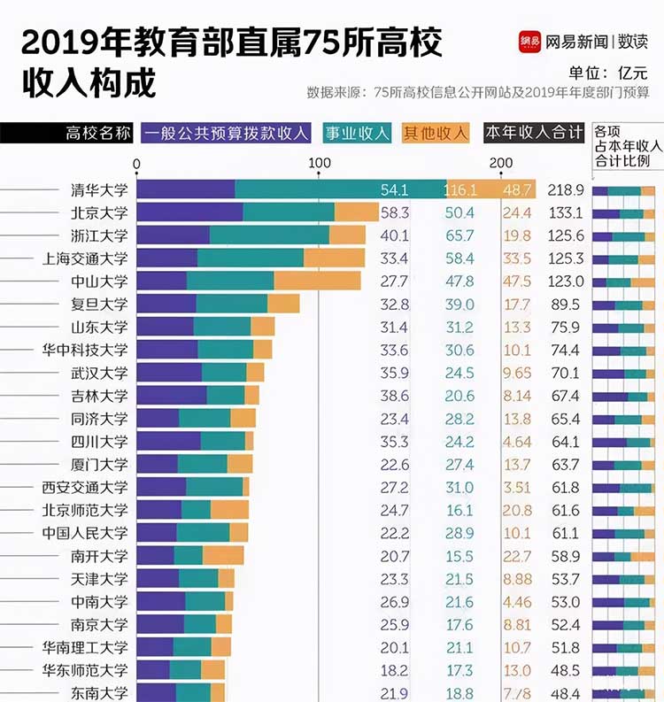 在著名大學中,除了清華北大國家直接撥款的“皇糧”在40多億這個級別外,其他著名高校基本都在20-30億,比較平均,并沒有我們想象的差距那么大。以2019年為例,總收入在前十名的高校中,國家的這筆撥款最高的為北大,58.3億,最低的是中山大學的27.7億。即便是純文科的中國人民大學,當年也有22.2億。