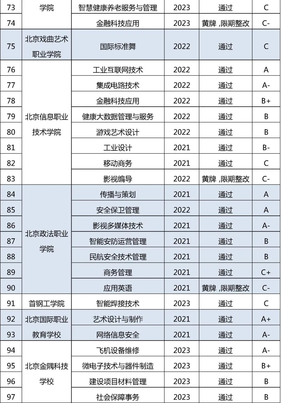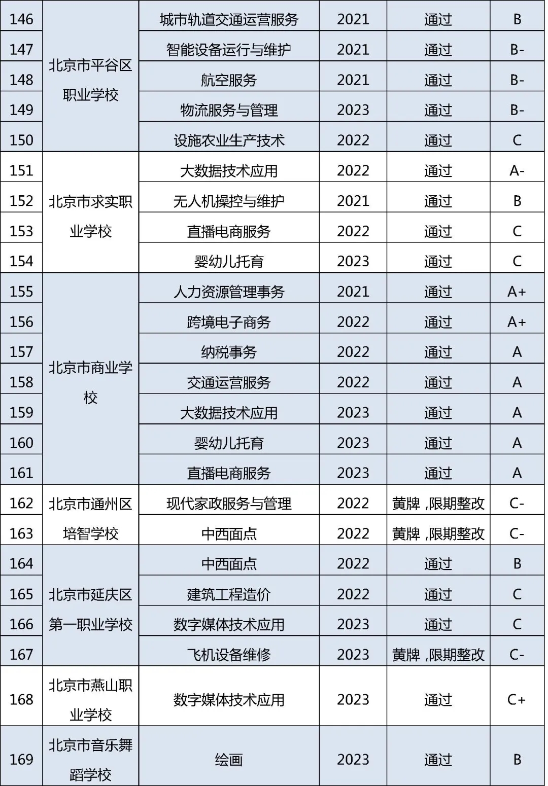 近日,2024年北京市職業院校近三年新增專業質量監測評價結果公布。評價結果顯示,36所職校163個專業予以通過,17所職校的28個專業給予“黃牌、限期整改”,要求限期整改。其中,9所高職的13個專業為“黃牌、限期整改”。