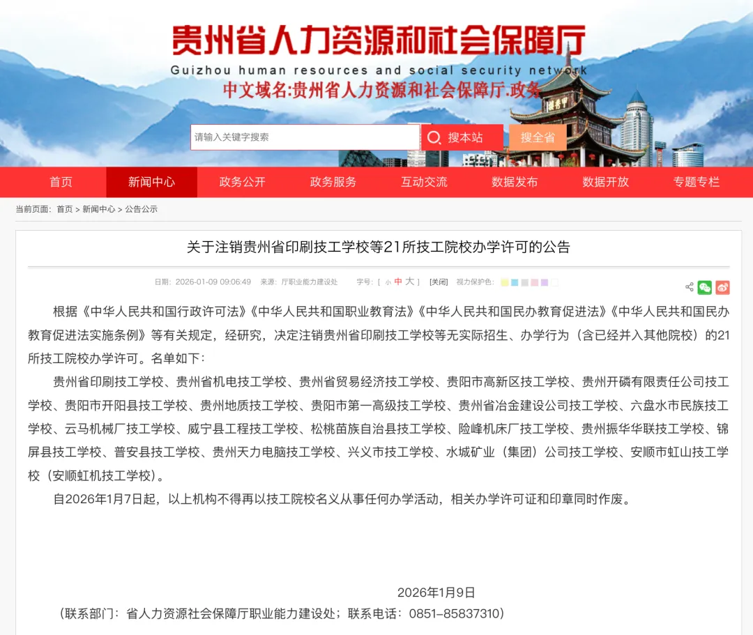 1月9日,貴州省人力資源社會保障廳發布《關于注銷貴州省印刷技工學校等21所技工院校辦學許可的公告》。
