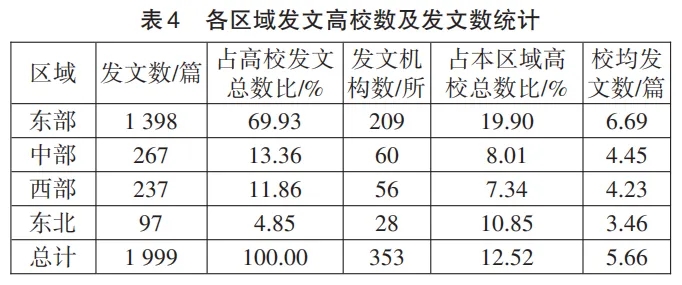 目前,我國高等教育在區域布局范圍內逐漸呈現集群分布的發展態勢,東高西低呈階梯狀分布,以區域文化為內核呈現出區域聚合狀態,大學集群與城市集群發展密切伴生。在構建新發展格局的大背景下,進一步打破區域壁壘,促進區域間高校協同發展,推進高等教育集群發展是實現高等教育高質量發展、建設教育強國的重要內容。高等教育科研活動是觀察區域高等教育區域發展集群、分化的重要參照,高等教育科研論文產出既是建設高等教育學科的結果,也是高等教育改革實踐活動的理論映射。從2023年各區域高等教育科研論文的產出分布來看,東北地區、中西部地區高校與東部地區的差距仍然較大。(見表4)