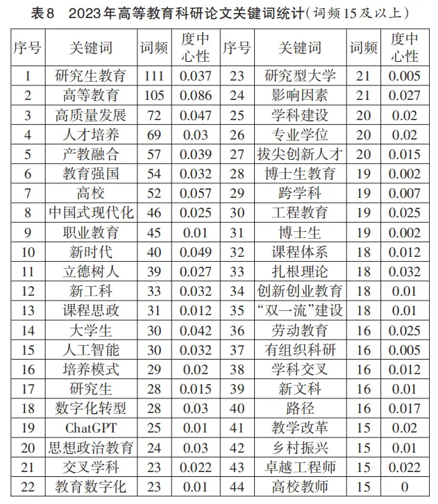 綜合考量高頻關鍵詞的詞頻和度中心性的分布情況并征求多位專家意見后,確定2023年度高等教育研究十大學術熱點,分別為教育高質量發展、建設教育強國、產教融合與校企合作、人才培養改革、教育數字化與智能化、新工科建設、課程思政、交叉學科、創新創業教育、勞動教育。本刊邀請了十位專家學者聚焦十大學術熱點展開研究評述,以反映各熱點領域的學術動態與發展趨勢。