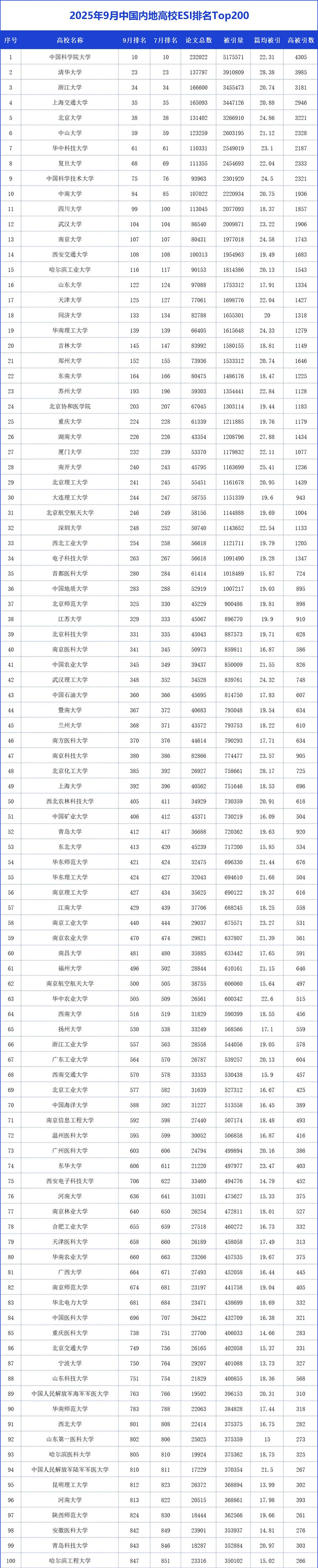 9月11日,科睿唯安(Clarivate Analytics)公布了2025年9月的ESI最新數據。從統計數據來看,本期(2025年9月)TOP200高校ESI綜合排名相比上一期(2025年7月)略有進步。