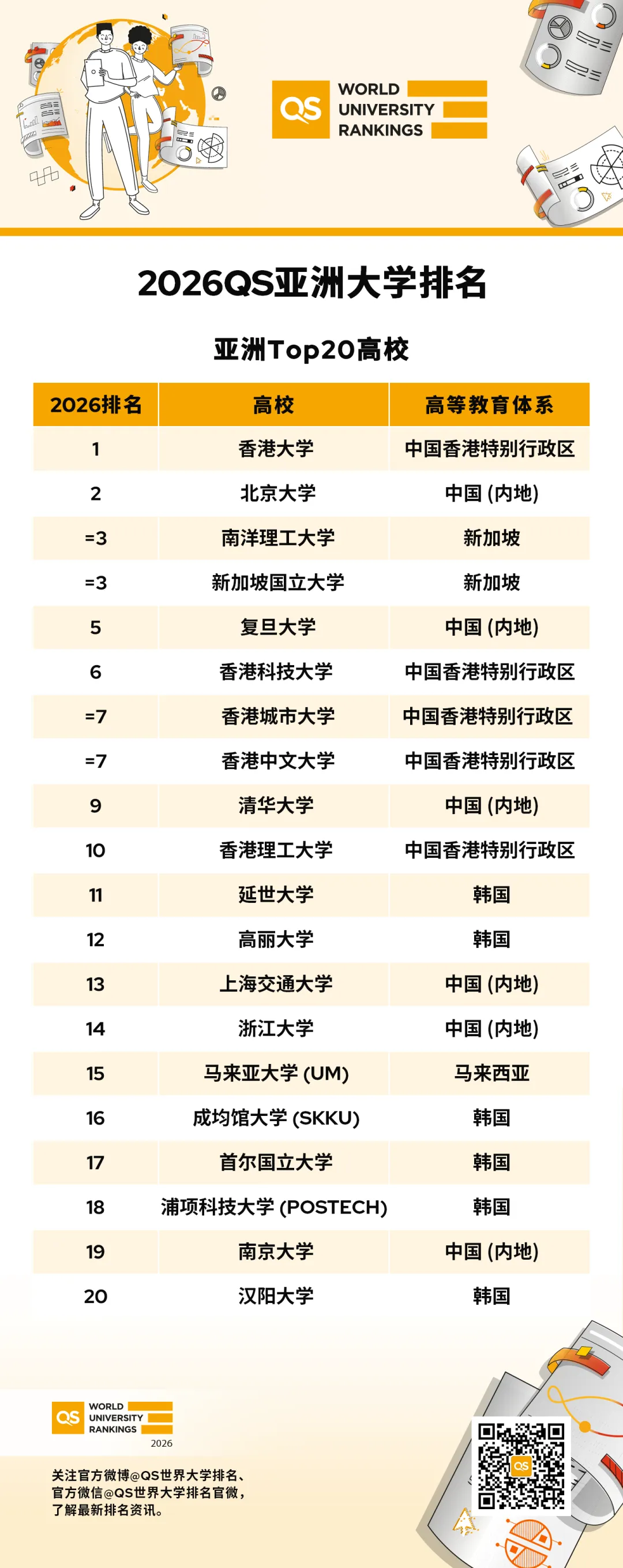 國際高等教育研究機構QS Quacquarelli Symonds于11月4日正式發布了2026QS亞洲大學排名。