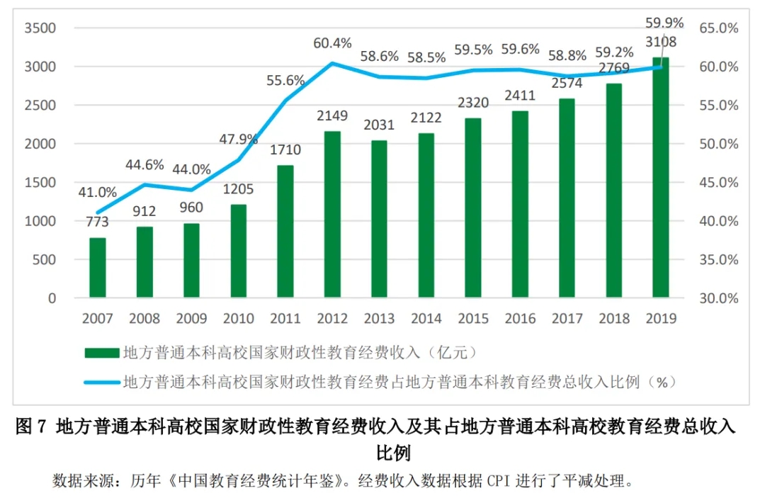 為進一步加大地方高等教育財政投入,使地方高校更好地承擔起實施科教興國戰略和人才強國戰略、建設創新型國家的歷史使命,在高等教育以大規模擴招為特征的外延式發展轉入以提高質量為特征的內涵式發展階段后,中央政府逐步進行政策調整,在增加中央政府對地方高校(地方所屬公辦普通本科高校)支持的同時,提高地方政府投入高等教育的積極性。2010年財政部、教育部出臺《關于印發<中央財政支持地方高校發展專項資金管理辦法>的通知》(財教〔2010〕21號),在原“中央與地方共建高等學校專項資金”的基礎上,設立支持地方高校發展專項資金,支持地方高校的重點發展和特色辦學。2010年11月30日,財政部、教育部發布《關于進一步提高地方普通本科高校生均撥款水平的意見》(財教〔2010〕567號),要求各地要根據高校合理需要,制訂本地區地方高校生均撥款基本標準。在此基礎上,結合財力情況、物價變動水平、高校在校生人數變化、工資標準調整等因素,建立地方高校生均撥款動態調整機制,逐步提高生均撥款水平。原則上,2012年各地地方高校生均撥款水平不低于12000元。2010年提高地方普通本科高校生均撥款水平的政策有效地確保了各省份及省級以下政府對地方高等教育的財政投入。此后,中央高校和地方高校之間差距開始逐步縮小。2010年,地方普通高校生均預算內教育經費支出占中央普通高校生均預算內教育經費支出的比例從42.68%增至46.94%,2012年升至60.53%,此后雖有下降,但一直維持在55%左右,2019年開始上升,2020 年達到 66.57%。