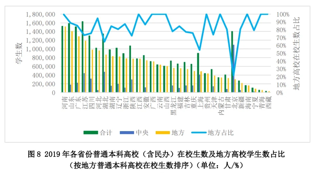 此外,本報告關于各省份高校間差異主要分析的是地方教育部門和其他部門辦的703所普通本科高校,不包括民辦普通本科高校,因此不能反映各省份地方普通本科高校的全貌。民辦高校在地方屬高校中占比38%,而且在各省份的分布差異很大,值得專門研究。