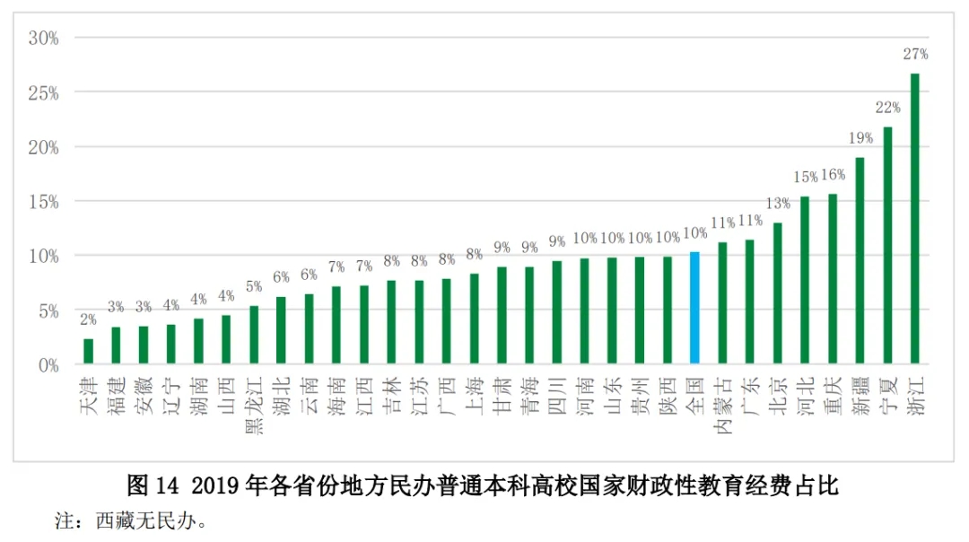 2019年地方民辦普通本科高校教育經費收入中國家財政性教育經費占比的全國平均水平約為10%,各省份也存在一定差異(圖14)。占比最高的省份為東部的浙江(27%),其次是西部的寧夏(22%)、新疆(19%)、重慶(16%),東部的河北(15%)、北京(13%)、廣東(11%)。占比低于5%的包括天津(2%)和福建(3%),中部的安徽(3%)、湖南(4%)、山西(4%),東北部的遼寧(4%)、黑龍江(5%)。