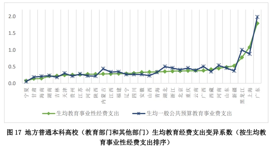 從生均一般公共預算教育事業費支出的變異系數來看,廣東(1.98)、黑龍江(1.00)、上海(0.88)、河南(0.53)、廣西(0.5)、湖北(0.5)的變異系數較大;陜西、貴州和海南(0.21)、甘肅和吉林(0.18)、寧夏(0.05)的變異系數較小。