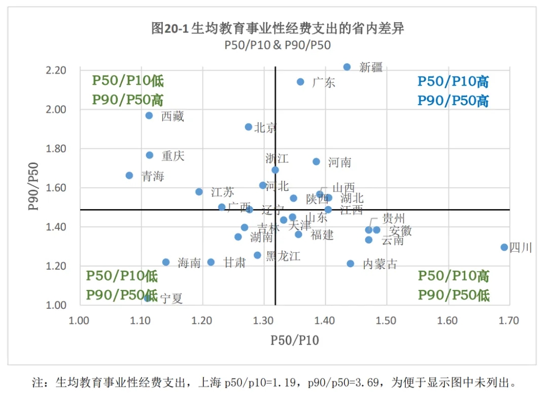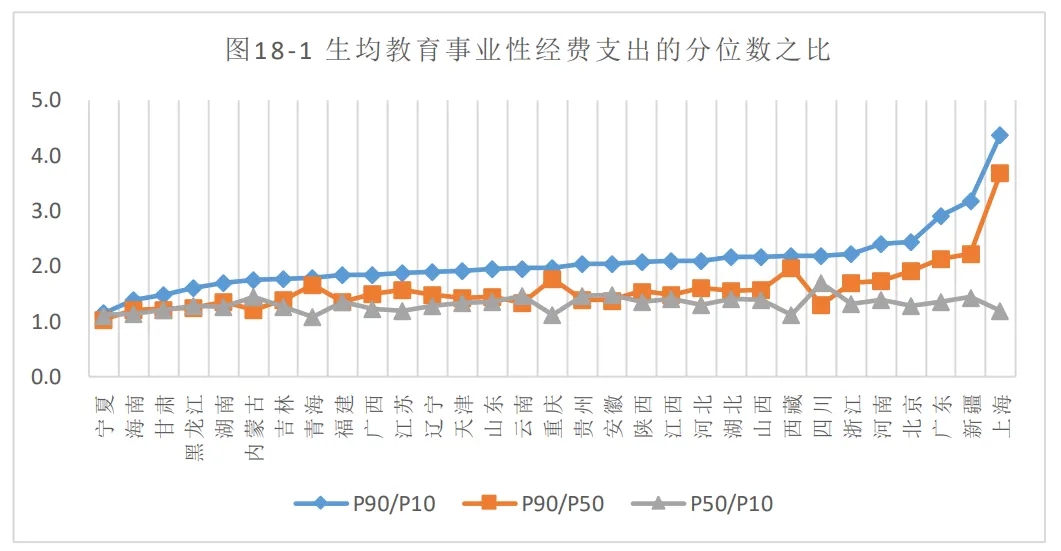 各省份高校間的總體差異體現在不同層次高校之間,我們用不同分位數之比來反映。圖18顯示的是各省份生均教育事業性經費支出、生均一般公共預算教育事業費支出的不同分位數之比。