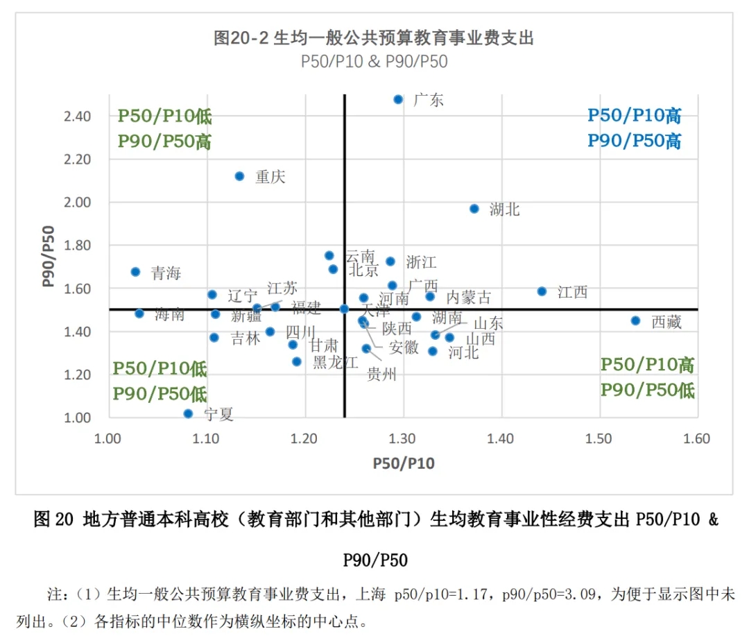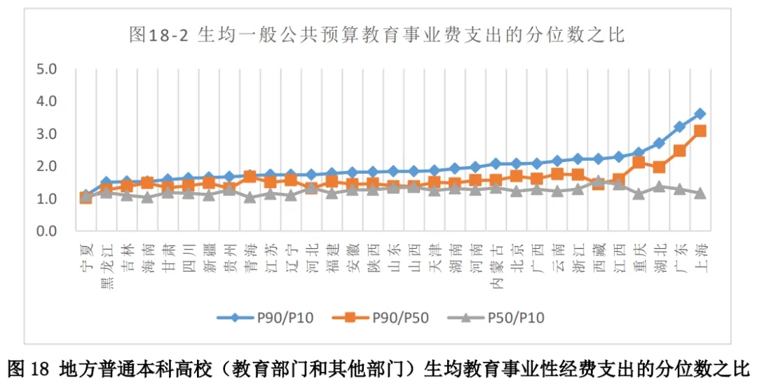 而從生均一般公共預算教育事業費支出不同分位數之比來看,其顯示的特征與生均教育事業性經費支出不同分位數之比的情況基本類似。略有不同的是,部分省份的位置發生了變化,包括湖北、重慶、北京、四川、江西等省,其反映出的高校間差異在某些層次的高校之間更加凸顯。其中,湖北、重慶是最高的90分位數高校與中部高校之間的差異更凸顯,北京則是最高的90分位數高校與中部高校之間的差異略降;江西是中部高校與最低10分位數高校之間的差異更凸顯,四川則是中部高校與最低10分位數高校之間的差異略降。