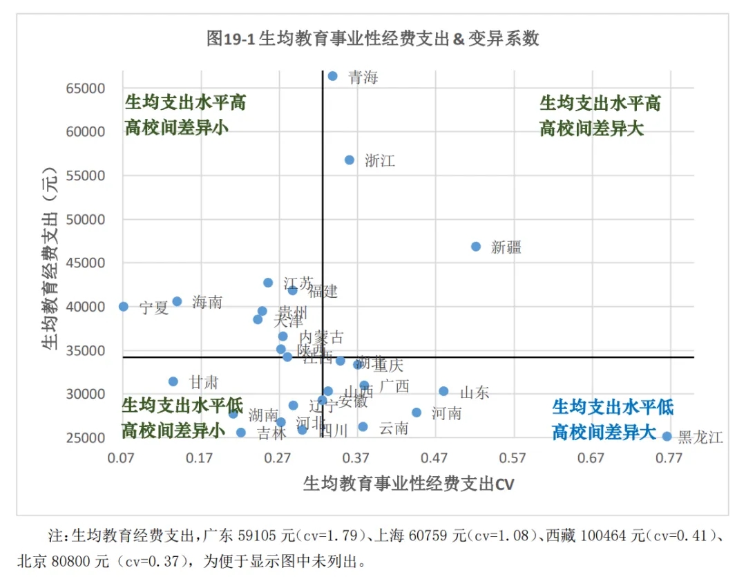 基于上述分析,我們從生均教育事業性經費支出水平及其變異系數綜合來看各省份的投入情況(見圖19):