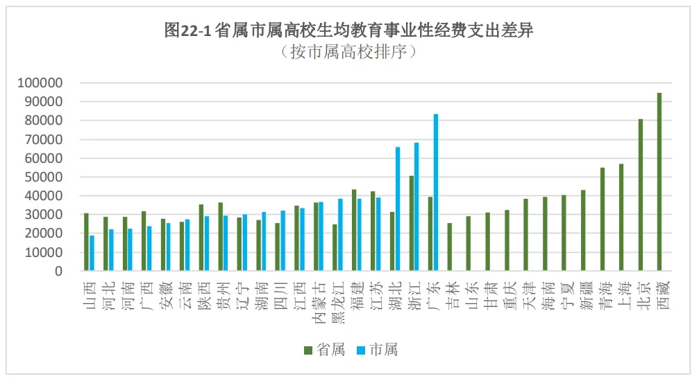 圖22-1顯示的是各省份省屬和市屬高校生均教育事業性經費支出的情況。在19個既有省屬又有市屬高校的省份中,有10個省份是省屬高校高于市屬高校,包括山西、河北、河南、廣西、陜西、貴州、福建、江蘇等,這些省份省屬高校獲得的經費投入較多,多元化籌資能力高于市屬高校;有9個省份是市屬高校高于省屬高校,包括廣東、浙江、湖北、黑龍江等,這些省份市屬高校獲得的經費投入較多。