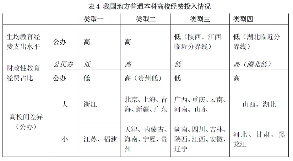 類型一:財政性教育經費占比低、生均教育經費支出水平高。其中,(1)高校間差異大:典型省份為浙江;(2)高校間差異小:典型省份包括江蘇、福建。類型二:財政性教育經費占比高、生均教育經費支出水平高。其中,(1)高校間差異大:典型省份包括北京、上海、廣東;(2)高校間差異小:典型省份包括天津、內蒙古。類型三:財政性教育經費占比低、生均教育經費支出水平低。其中,(1)高校間差異大:典型省份為廣西、重慶;(2)高校間差異小:典型省份為湖南、四川。類型四:財政性教育經費占比高、生均教育經費支出水平低。其中,(1)高校間差異大:典型省份為山西、湖北;(2)高校間差異小:典型省份為河北、甘肅。
