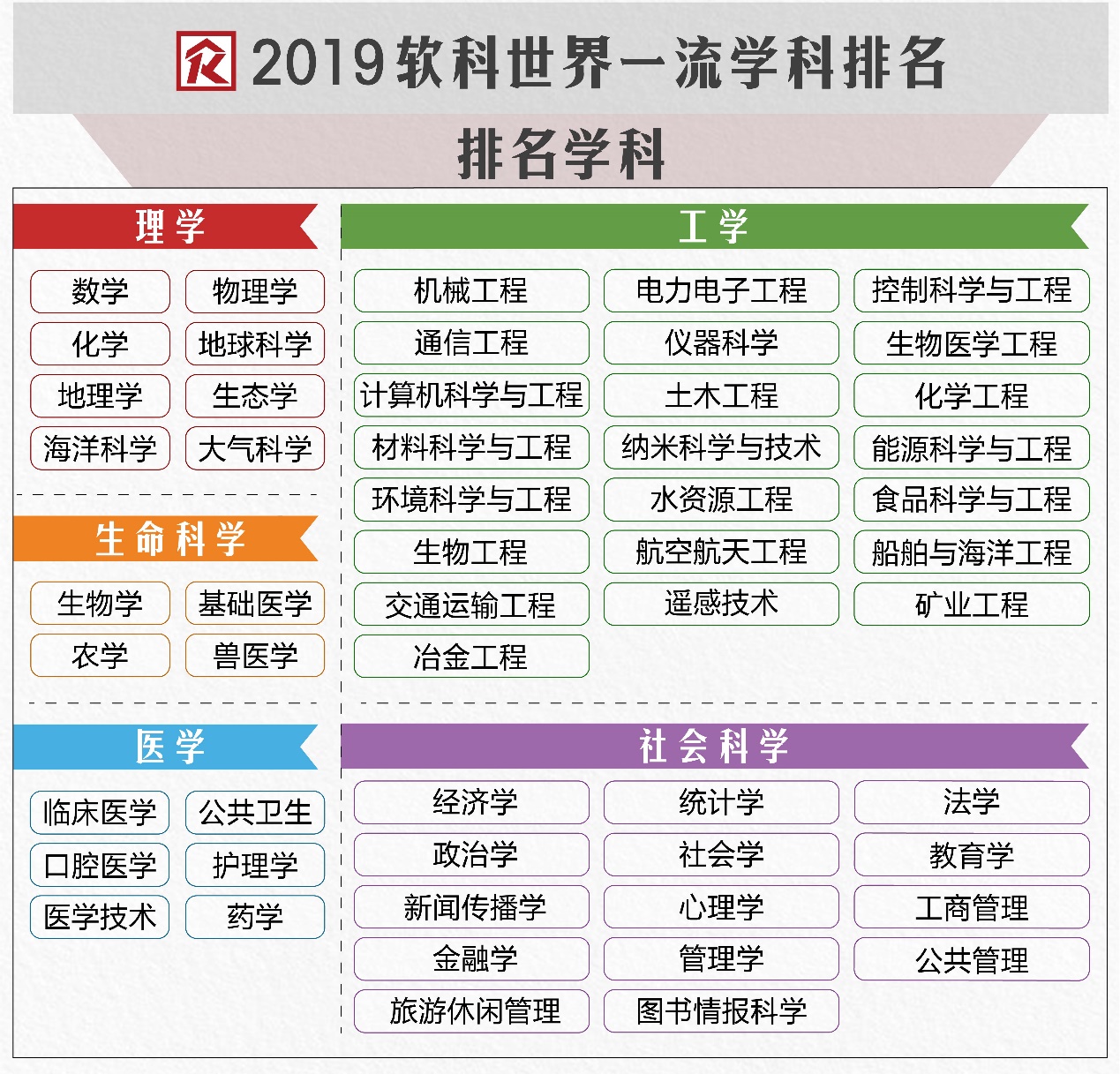 軟科今日(26日)正式發布2019“軟科世界一流學科排名”(ShanghaiRanking's Global Ranking of Academic Subjects)。2019年排名覆蓋54個學科,涉及理學、工學、生命科學、醫學和社會科學五大領域。