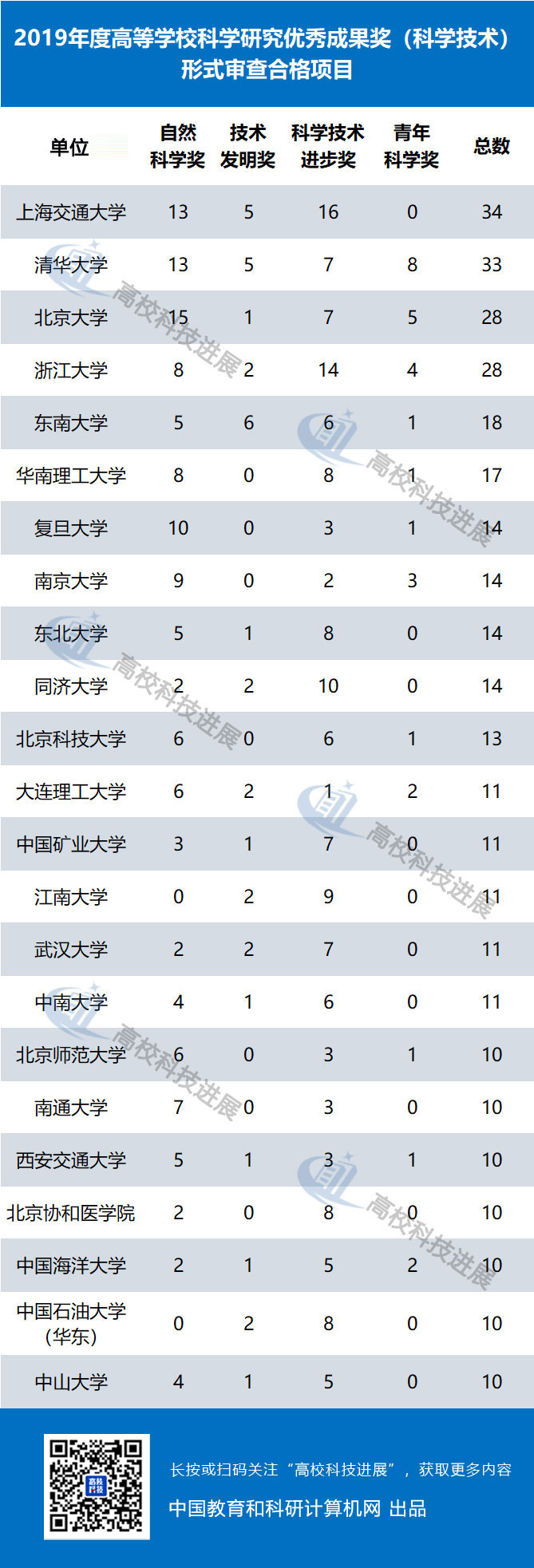 科學技術進步獎共有422項(通用項目406項,專用項目16項)形式審查合格。在通用項目的統計結果中,共有167所高校以第一完成單位牽頭的項目通過審查。形式審查合格項目較多的高校分別是上海交通大學16項,浙江大學14項,同濟大學10項,江南大學9項,北京協和醫學院、東北大學和中國石油大學(華東)均為8項,北京大學、清華大學、武漢大學和中國礦業大學各有7項,北京科技大學、東南大學、中南大學、首都醫科大學、江蘇大學分別有6項,北京林業大學、中國礦業大學(北京)、中國醫科大學、河海大學、中國海洋大學、華中科技大學、中山大學、華南理工大學、中國人民解放軍海軍軍醫大學以及五邑大學各有5項。