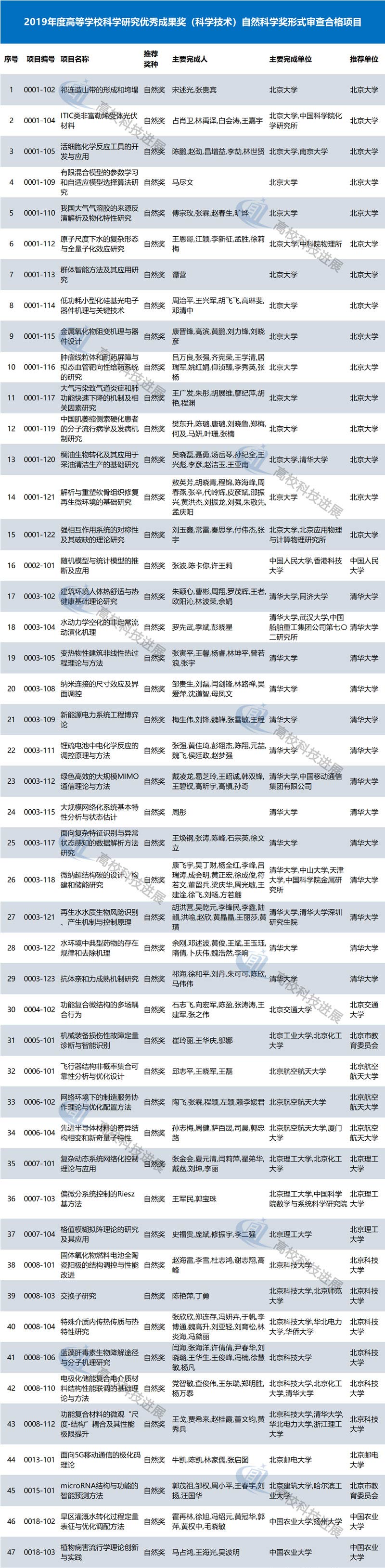 7月22日,2019年度高等學校科學研究優秀成果獎(科學技術)推薦/提名工作已結束。教育部科技司組織對候選項目/候選人進行了形式審查,確定形式審查合格941項/人(含專用項目32項),不合格92項,形式審查過程中,推薦/提名單位或專家提出撤銷推薦/提名13項。形式審查合格項目中,自然科學獎347項,技術發明獎125項(通用項目109項,專用項目16項),科學技術進步獎422項(通用項目406項,專用項目16項),青年科學獎候選人47人。