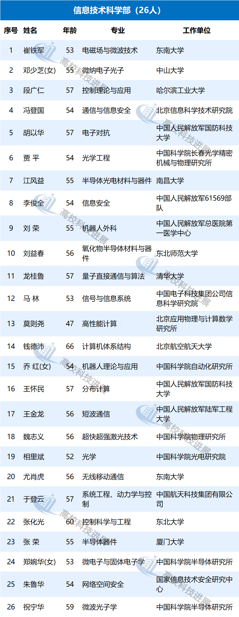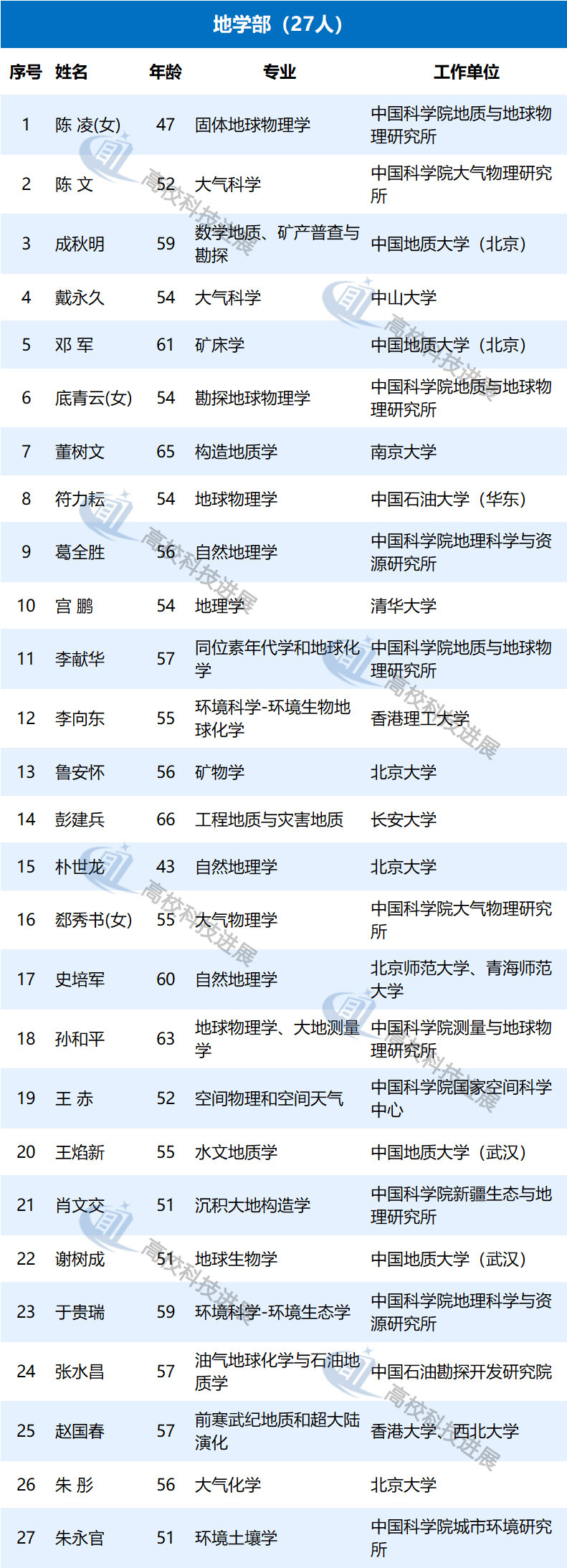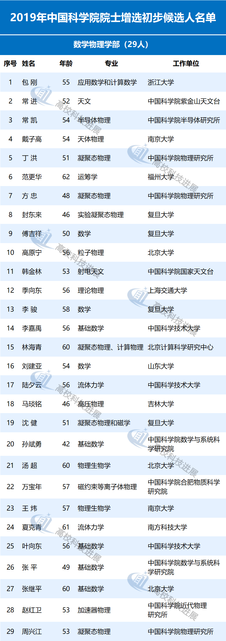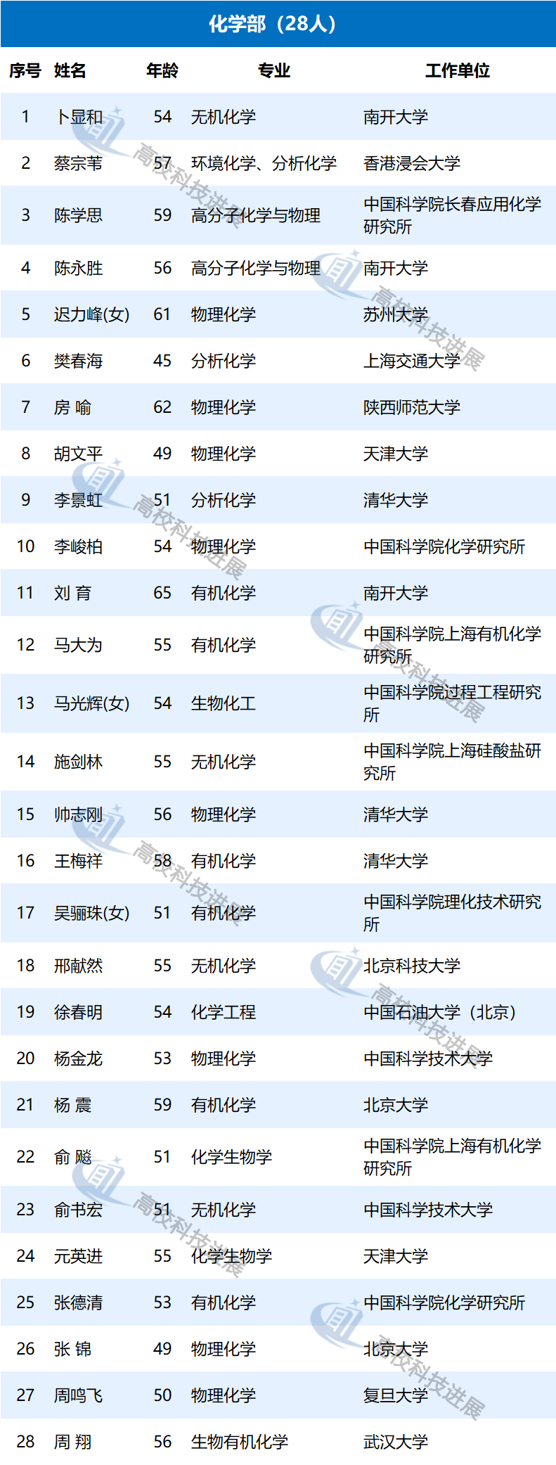 此外,據中國教育網統計發現,在來自高校的初步候選人中,年齡最大的為68歲,50歲以下的有9位,年齡最小的為43歲,是北京大學樸世龍教授。