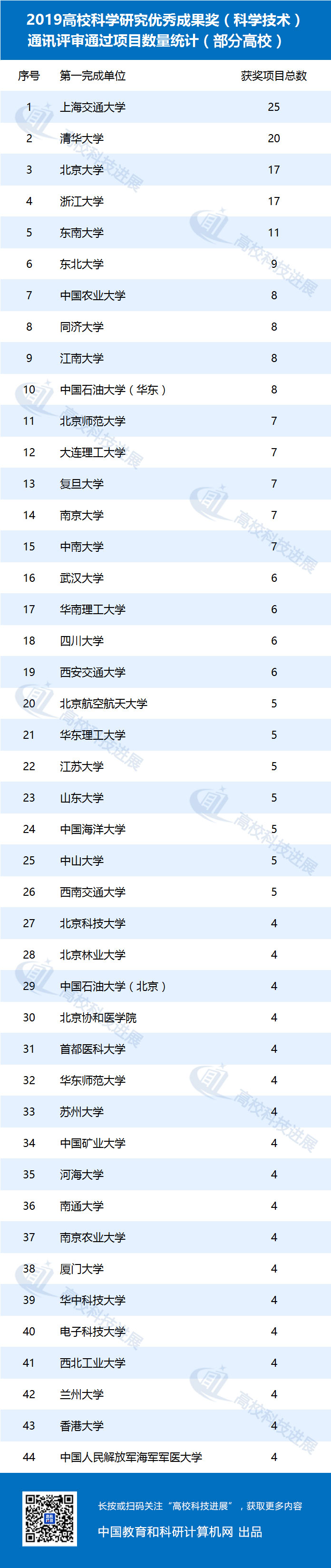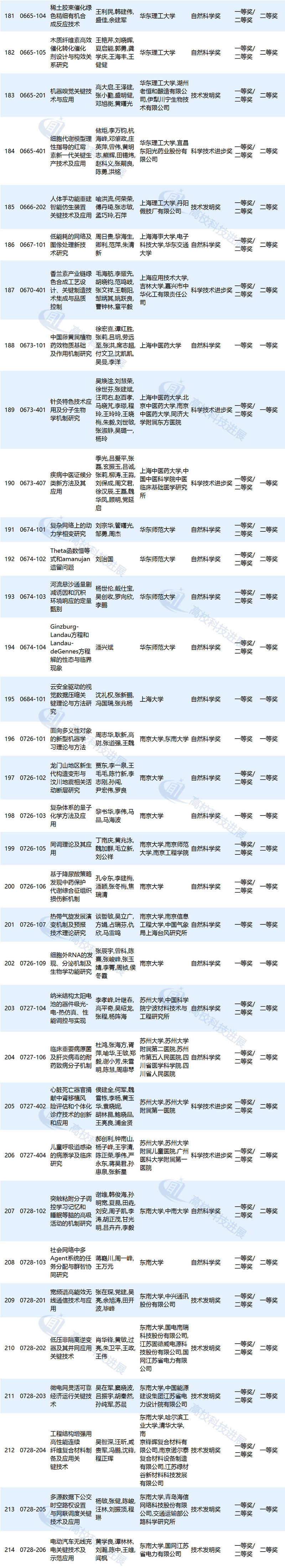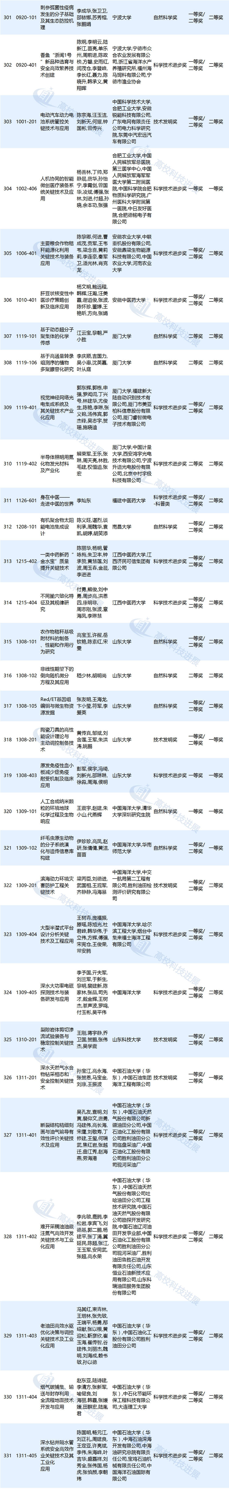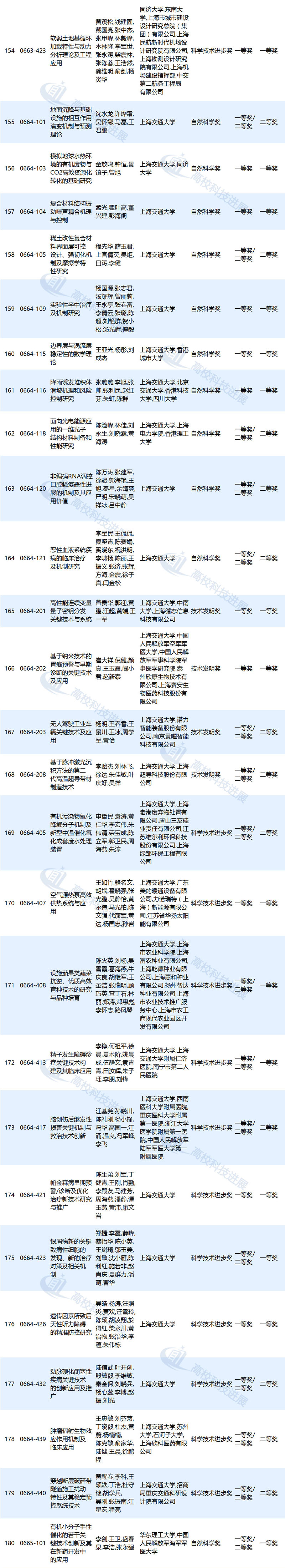 作為第一完成單位,上海交通大學獲獎項目為25項,清華大學獲獎項目為20項,北京大學、浙江大學獲獎項目分別為17項,東南大學獲獎項目為11項,東北大學獲獎項目為9項,中國農業大學、同濟大學、江南大學、中國石油大學(華東)等高校獲獎項目分別為8項,大連理工大學、復旦大學、南京大學等高校獲獎項目分別為7項,武漢大學、華南理工大學、四川大學等高校獲獎項目分別為6項,北京航空航天大學、華東理工大學、山東大學等高校獲獎項目分別為5項,北京科技大學、北京林業大學、北京協和醫學院等高校獲獎項目分別為4項(高校獲獎情況詳見文末附表)。