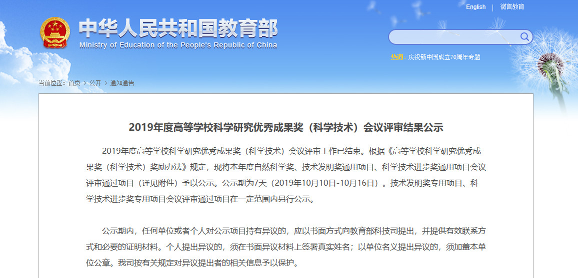 10月10日,教育部科技司正式對外公示2019年度高等學校科學研究優秀成果獎(科學技術)(以下簡稱“優秀成果獎”)會議評審結果。本次評審出的自然科學獎121個、技術發明獎通用項目45個、科學技術進步獎通用項目129個,共計295個獎項。