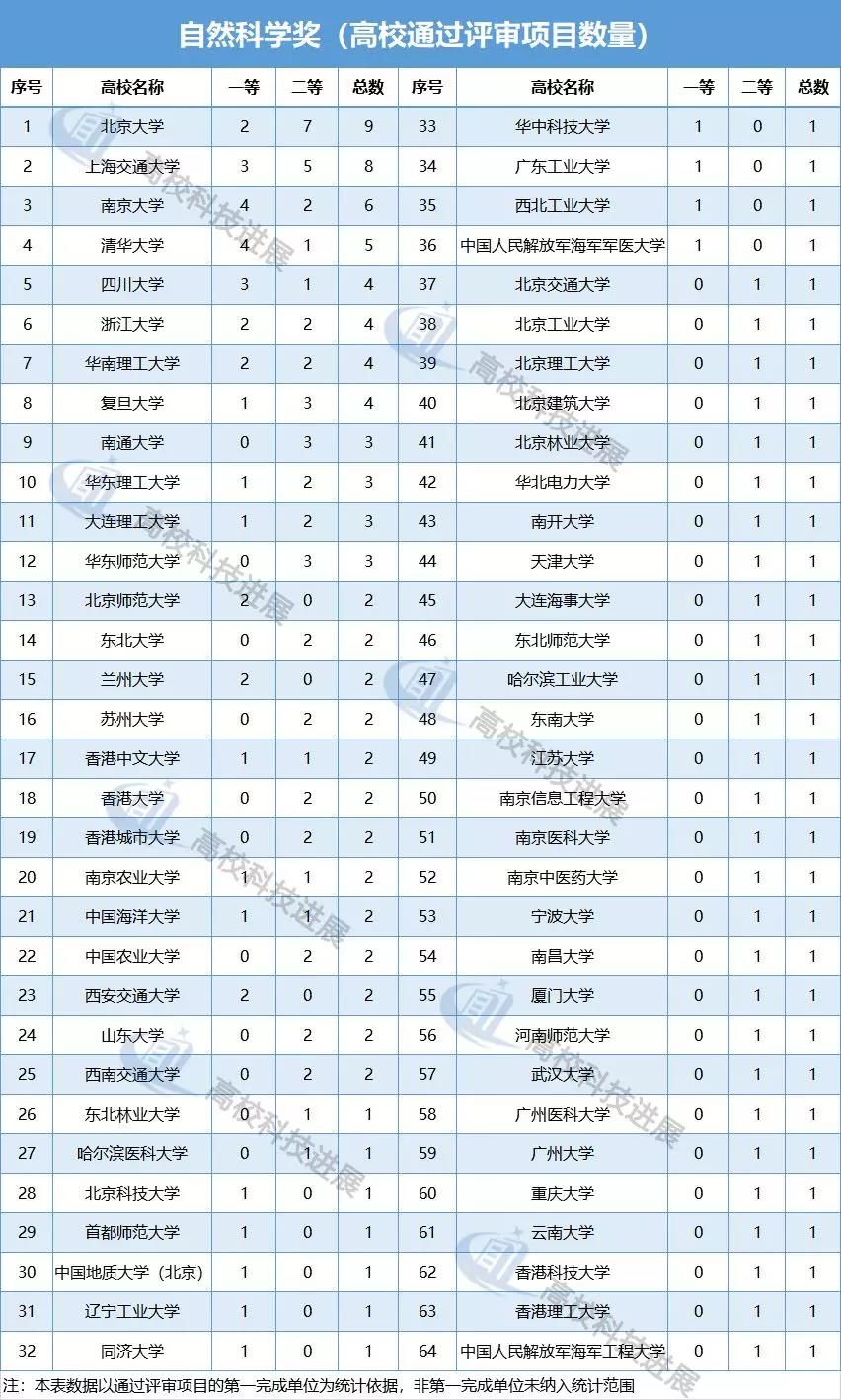 從自然科學獎的會議評審結果來看,共有64所高校推薦項目通過評審。