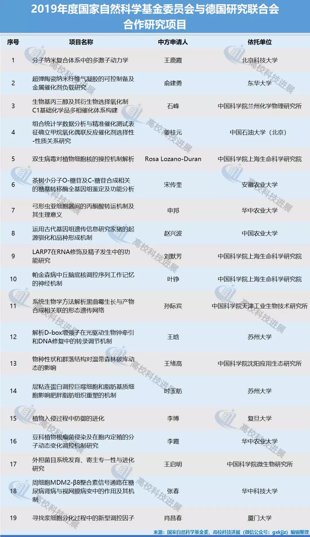 2019年度中俄合作研究項目聚焦“基于現代腦科學的神經精神疾病研究”、“從衰老機制到老年醫學的轉化醫學研究”、“腫瘤診斷與治療新技術”、“跨境傳染病”等領域,共有10個項目獲得批準,中方資助強度為不超過100萬元/項;中德合作研究項目聚焦“化學”、“生命科學”、“管理科學”和“醫學”領域,共有19個項目獲得批準,中方資助強度為不超過300萬元/項。