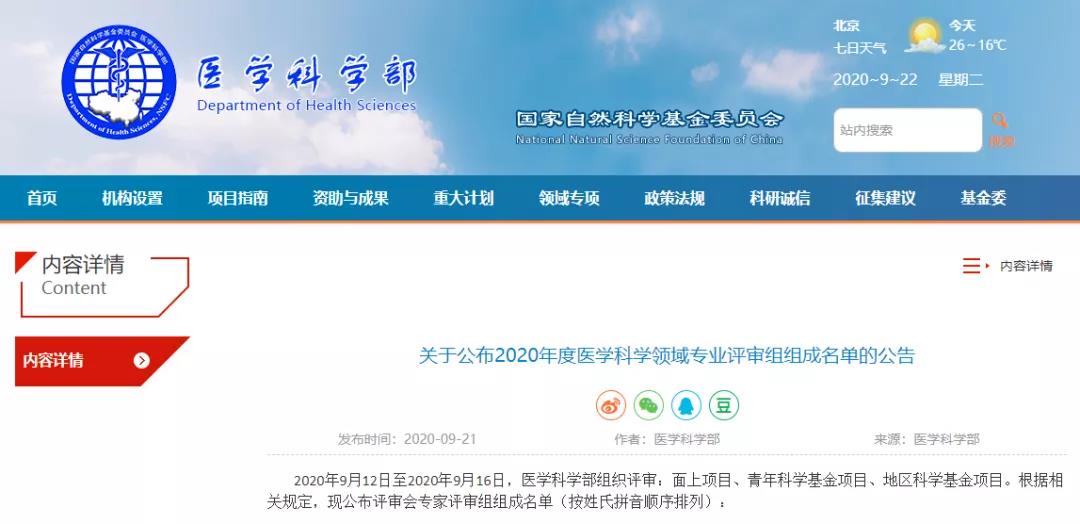 ▲ 國家自然科學基金委醫學科學部網站截圖