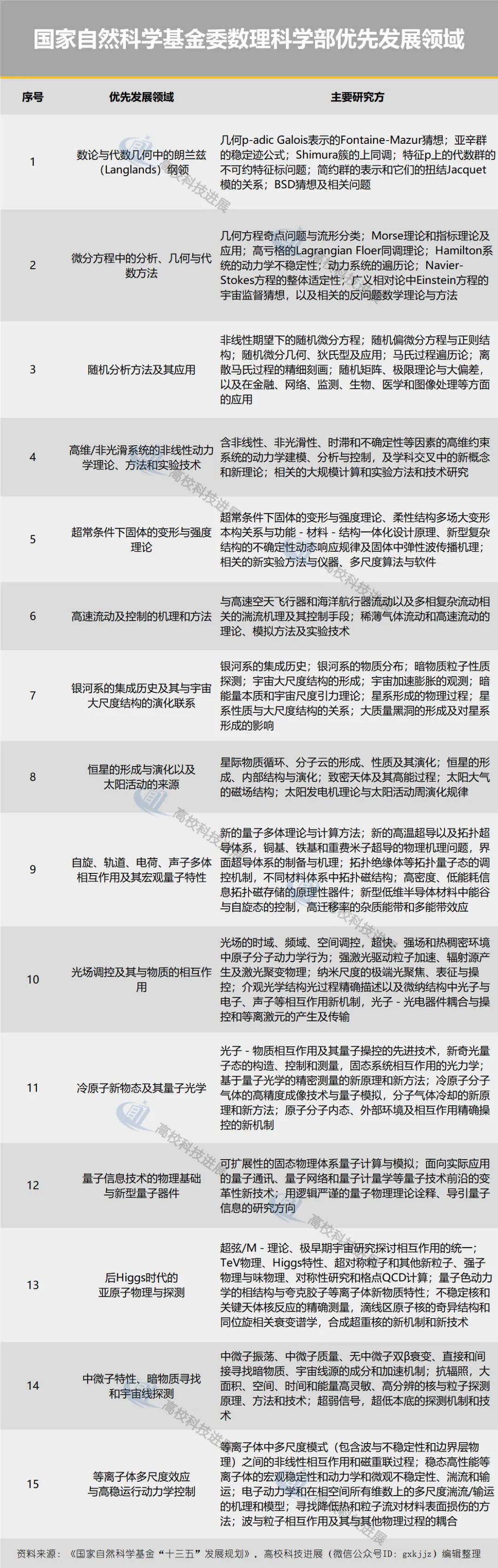 按照《發展規劃》,數學物理科學部在“十三五”期間擬優先發展的領域包括“數論與代數幾何中的朗蘭茲(Langlands)綱領”“超常條件下固體的變形與強度理論”“恒星的形成與演化以及太陽活動的來源”“冷原子新物態及其量子光學”“量子信息技術的物理基礎與新型量子器件”,以及“中微子特性、暗物質尋找和宇宙線探測”等15個領域。