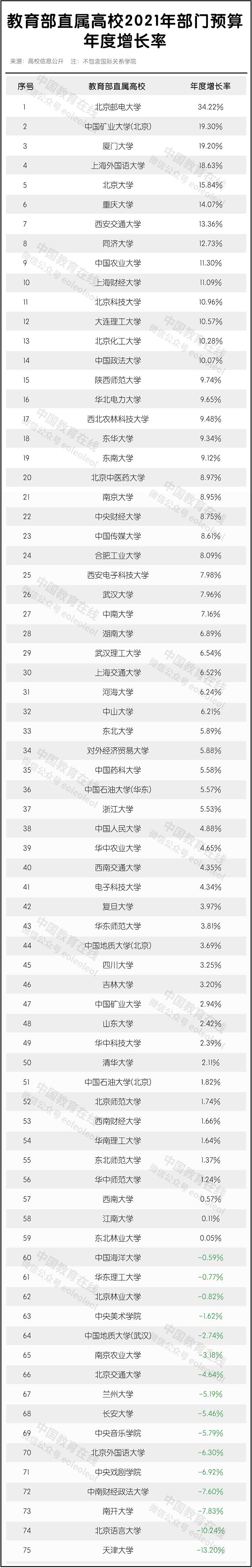 從年度增長率來看,北京郵電大學達到34.22%。13所高校增長率在10-20%之間。16所高校預算經費有所下降。