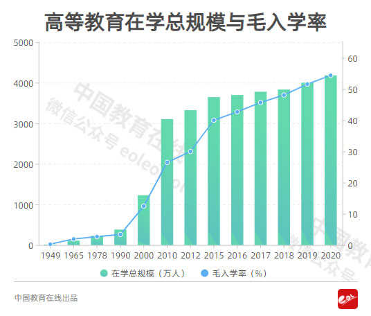 隨著高校的進一步擴招,全國高等教育總規模在之后幾年又迅速增長,2010年已達到3105萬人。2014年,在校生規模達到3559萬人,居世界第一。2020年,全國各類高等教育在學總規模達到4183萬人。